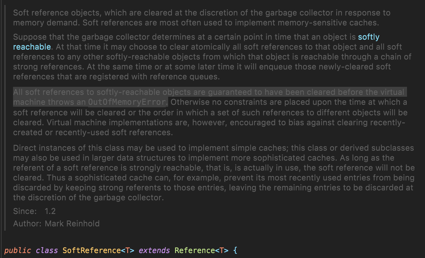 Soft Reference는 힙 영역의 메모리가 충분하면 GC가 soft referenced로 참조되고 있는 objects를 수거하지 않습니다. 자바는 `OutOfMemoryError`가 뜨기 전에 soft referenced objects를 지우는 것을 보장합니다.