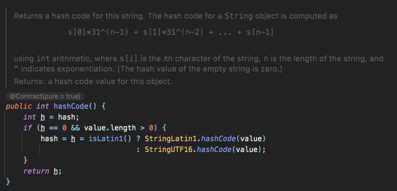 - 멤버변수 hash가 있으면 즉, hash code를 계산한 적이 있어서 int 기본값인 0이 아니면 멤버변수 hash를 반환합니다