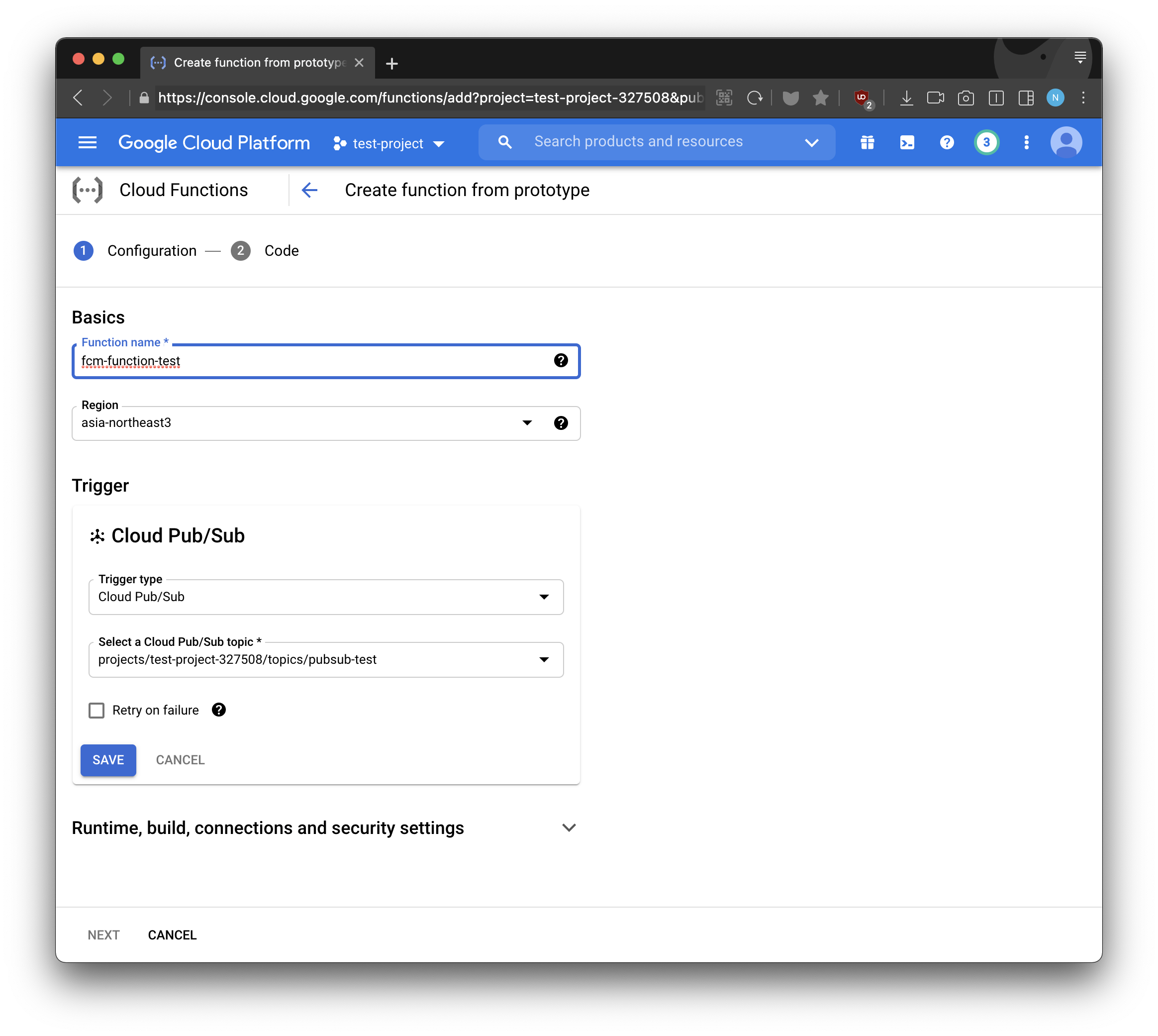 - 함수 이름과 GCP Pub/Sub의 topic을 선택하고 NEXT를 선택합니다