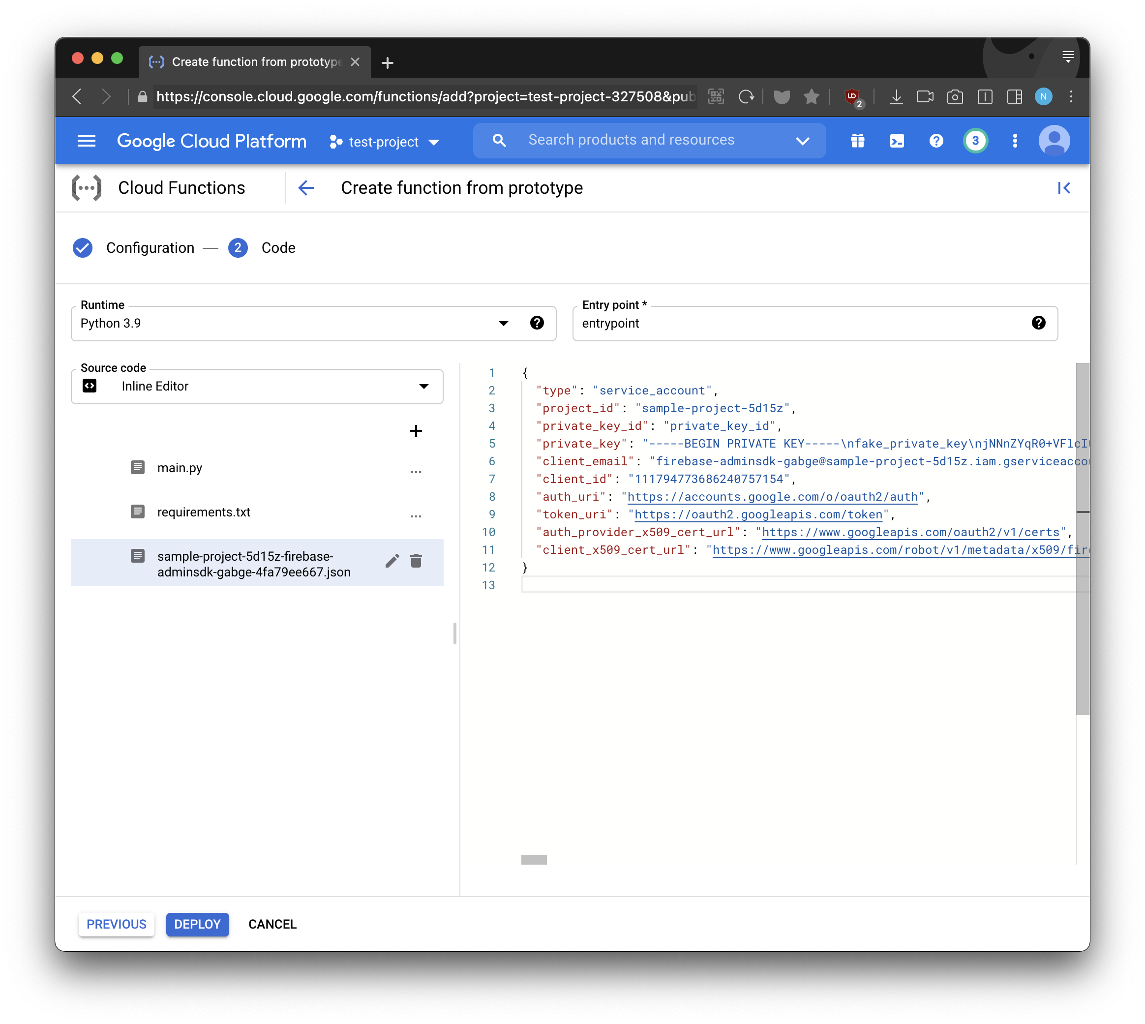 sample-project-5d15z-firebase-adminsdk-gabge-4fa79ee667.json을 생성합니다
