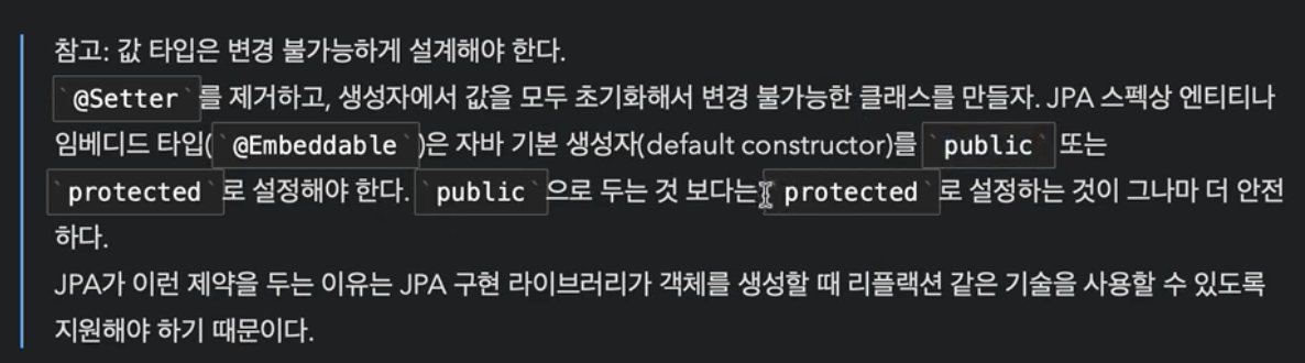 // 값 타입은 immutable 해야하므로 @Setter 를 만들지 않는다
