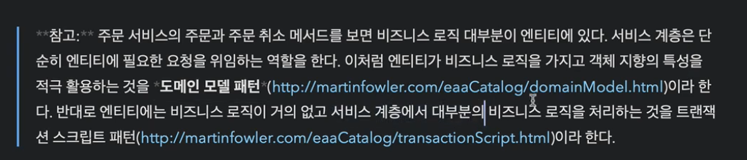 기존에는 Transaction Script 패턴에 가깝게 개발해서 로직을 개발할 때 일련의 관련된 로직들을 신경쓰면서 잊지 않고 넣어야 했는데 도메인 모델 패턴이 이런 점에서 확실히 좋다고 생각이 들었다 (객체지향적, 코드 응집)