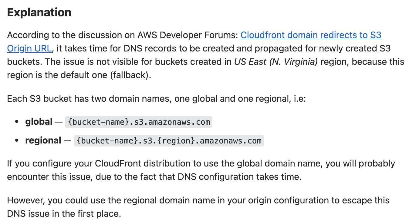 그래서 cloudfront url로 접속했을 때 s3의 글로벌 도메인으로 접속했고 글로벌 리전까지 아직 propagation 되지 않아서